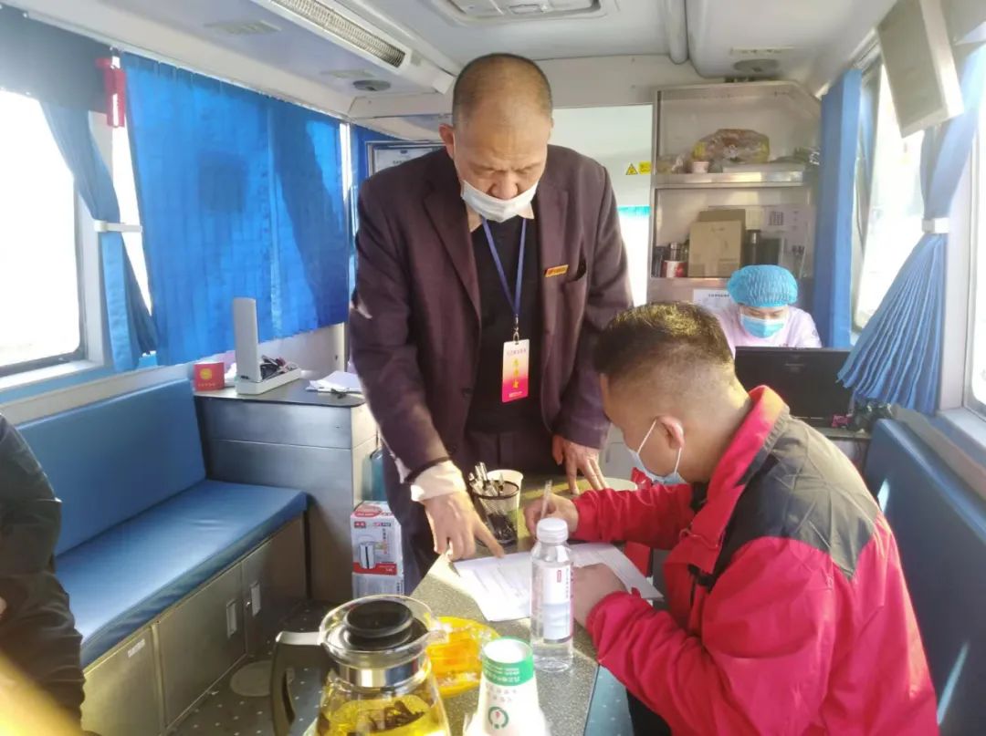2020年11月13日,在阜康市无偿献血车上,陆升甲指导献血者填写申请表。(阜康市委宣传部供图)