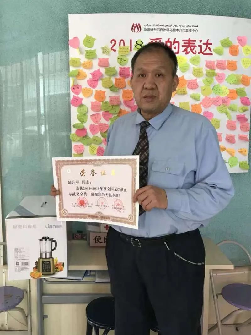 陆升甲坚持无偿献血17年,已累计献血达44000毫升,获得“全国无偿献血奉献奖金奖”三次,也是阜康市首位遗体捐献者。