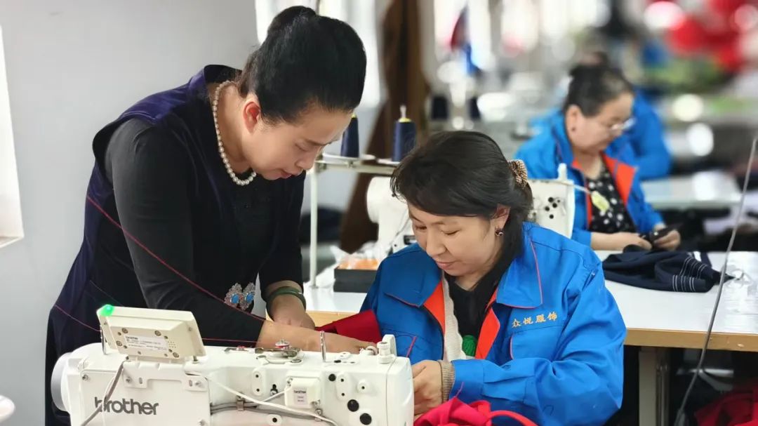 张瑞萍指导企业职工缝制衣物。(木垒县委宣传部供图)