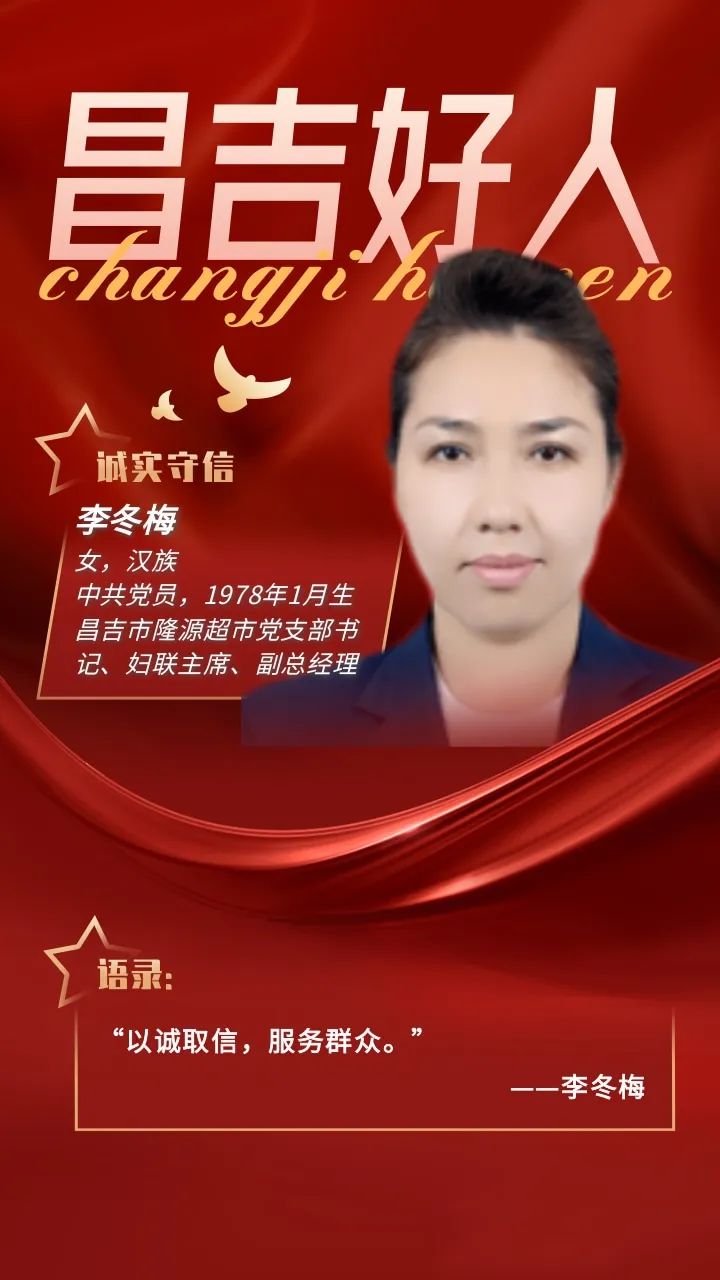 李冬梅,1978年出生在新疆南疆的一个小县城,生长在乌鲁木齐市,25岁的她和许多年轻人一样,怀揣着对未来美好生活的向往来到了昌吉,从一名业务管理人员开始不断学习进取,无数个寒来暑往她始终坚持用事实说话,在平凡的岗位努力积累经验,书写自己人生的诚信答卷。