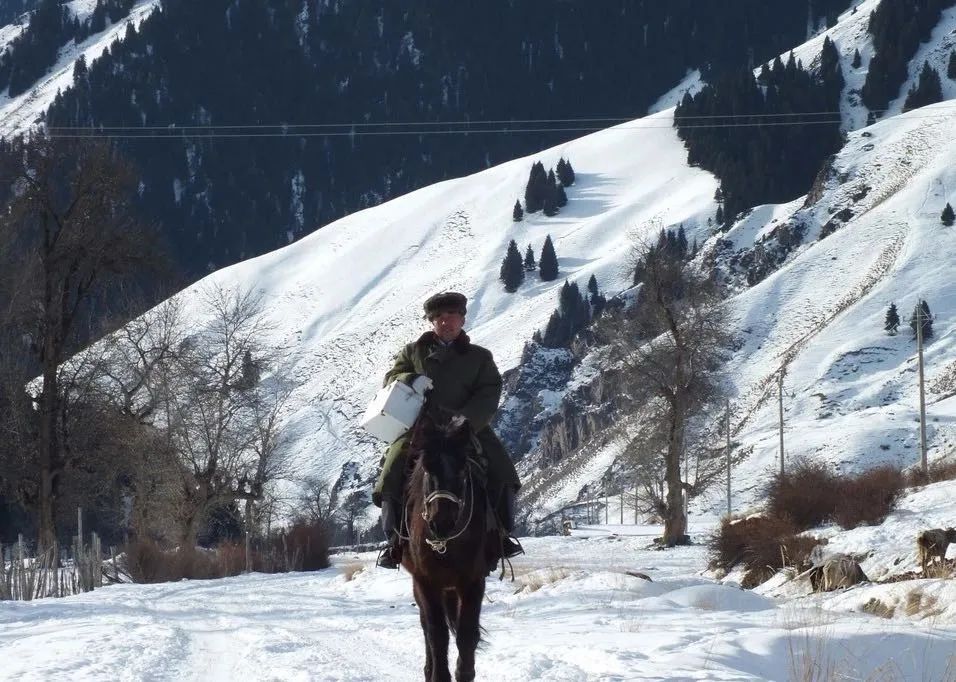 在寒冷的冬季,夏麦依·阿力木汗骑着马,背着小药箱,进山为牧民看病。(奇台县委宣传部供图)