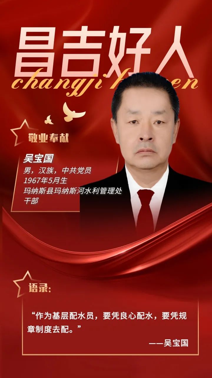 吴宝国出生于玛纳斯县一个普通的水利职工家庭,他的父亲吴元宵是一名老水利工作者,他常常背着幼小的吴宝国巡渠、测水。啃干粮、吃咸菜、喝井水、住土房,在父亲的言传身教下,吴宝国秉承父亲吃苦耐劳的水利精神,以成为一名优秀的水利人为初心,在毕业后如愿接过父亲手中的“接力棒”,成为了新户坪水库管理站的一名职工。吴宝国患有小儿麻痹症,落下了左下肢三级残疾,在父亲的鼓励与影响下,吴宝国没有气馁,他怀抱对学习和生活的热情,以顽强的毅力与优异的成绩考取了水利水电工程专业。刚工作时,为提高业务能力,谦虚好学的吴宝国下班后常常在清冷的宿舍里挑灯夜读订阅的专业报刊杂志,常常向老同志请教,将理论知识和实践紧密结合,学以致用,举一反三。