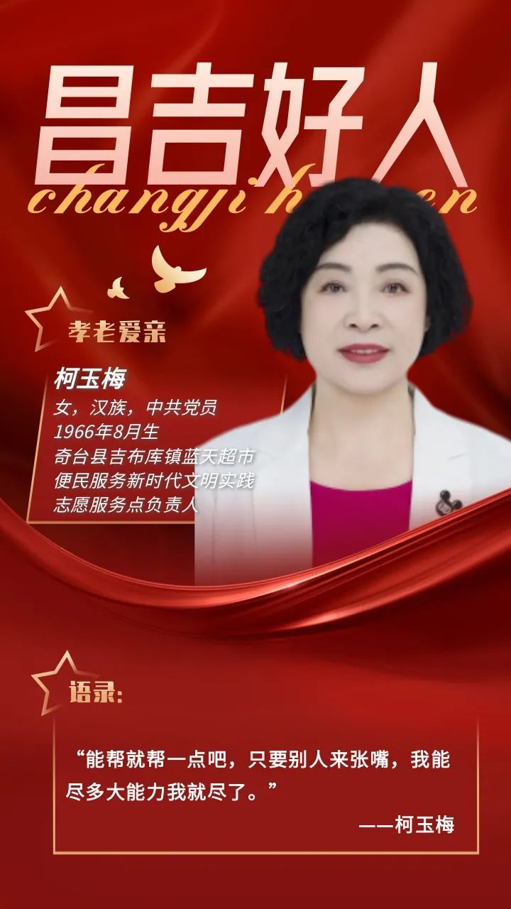 柯玉梅全心全意照顾父母,20多年来事无巨细,嘘寒问暖,从未有过厌烦。她悉心照料患有支气管炎、肺心病、心脏病的母亲,默默陪伴父亲,帮助邻里、热心公益,是远近闻名孝顺能干的好女儿,她用自己的实际行动诠释“孝”和“爱”。柯玉梅曾荣获全国“最美家庭”、自治区“创业标兵”、昌吉州“三八红旗手”等称号。
