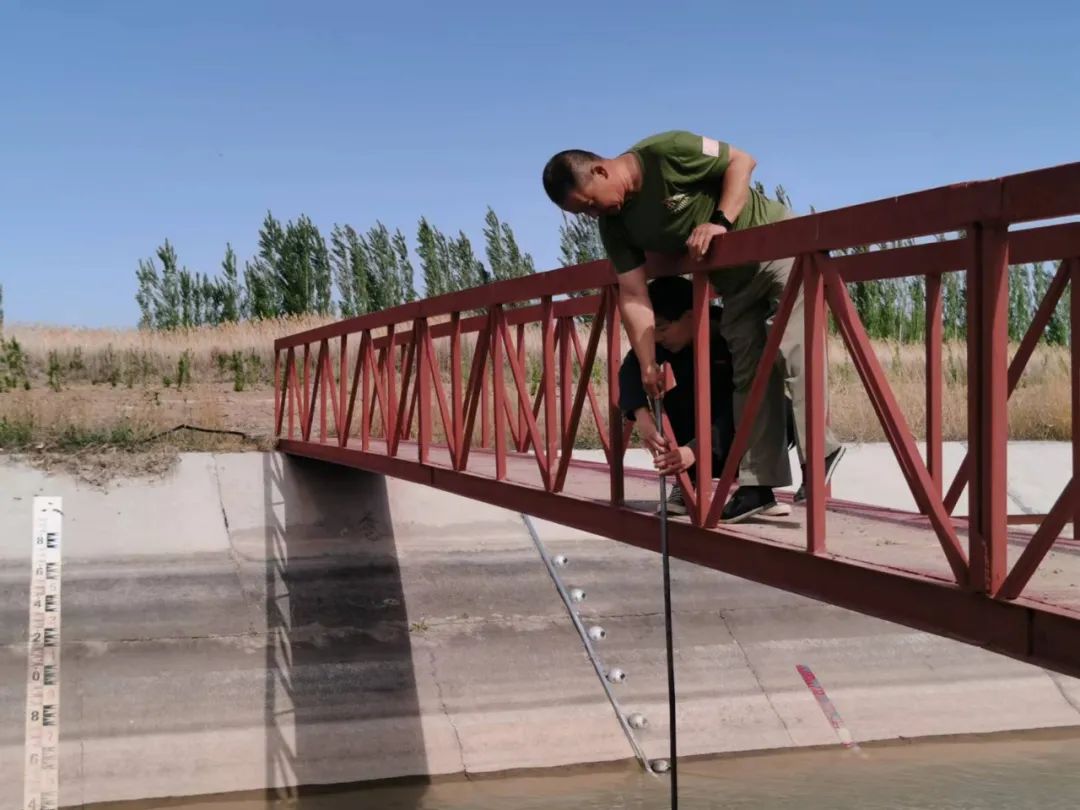 吴宝国在北六干渠测量渠道水量。(玛纳斯县委宣传部供图)