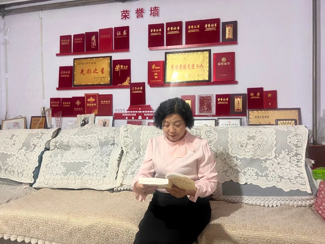 柯玉梅的爱好是读书,背后墙上挂满了她近年来获得的荣誉。(奇台县委宣传部供图)