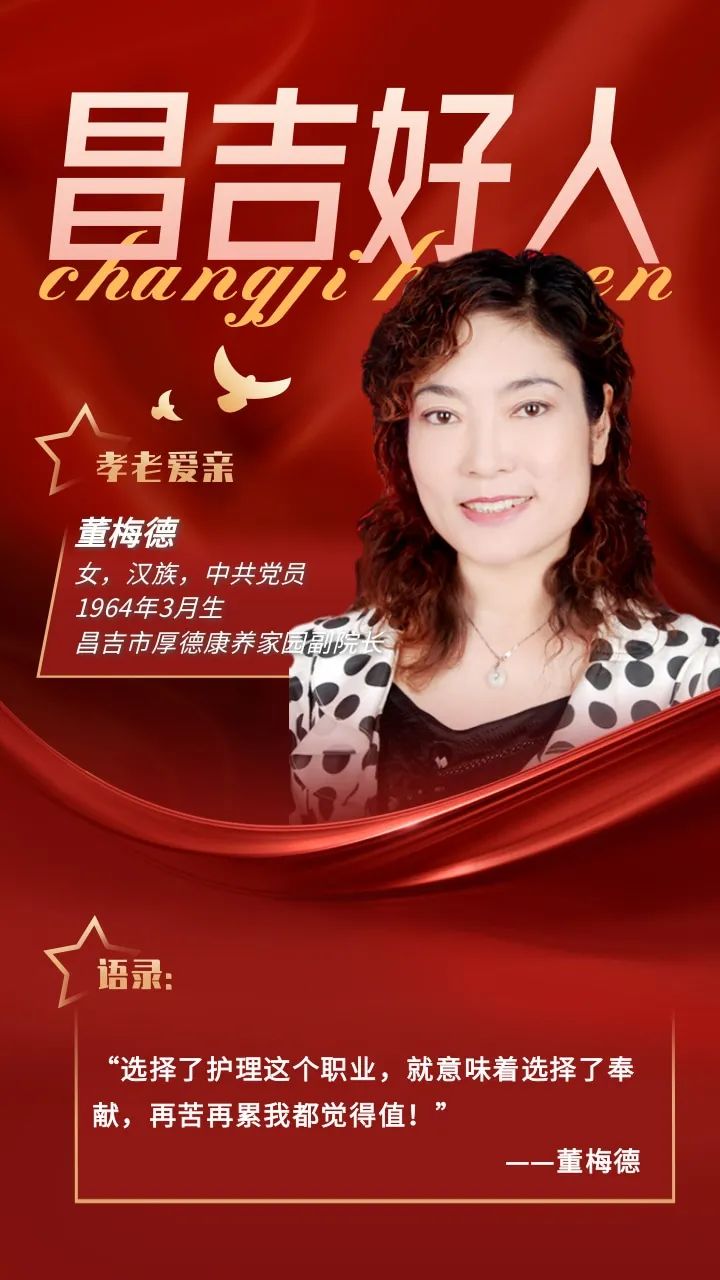 董梅德做好院里老人的每件小事,以一片真心换老人舒心。“只要老人安好,我才能安心。”董梅德说。她用自己的无私奉献和坚守,为每位老人创造了一个安心、温暖的家园,让老人们感受到家庭般的关怀和温暖。她先后获“全国杰出护理工作者”“第二届全国百名优秀护理标兵”、自治区“开发建设新疆奖章”“先进工作者”、昌吉州“五一劳动奖章”“2019年度老年健康教育工作先进个人”“2023年度老年保健工作先进个人”等殊荣。董梅德以奋发有为的精神鼓舞和带动着年轻一代,同时激励更多人投身养老服务事业中,推广养老护理技能,在推动养老事业发展方面贡献巾帼力量。