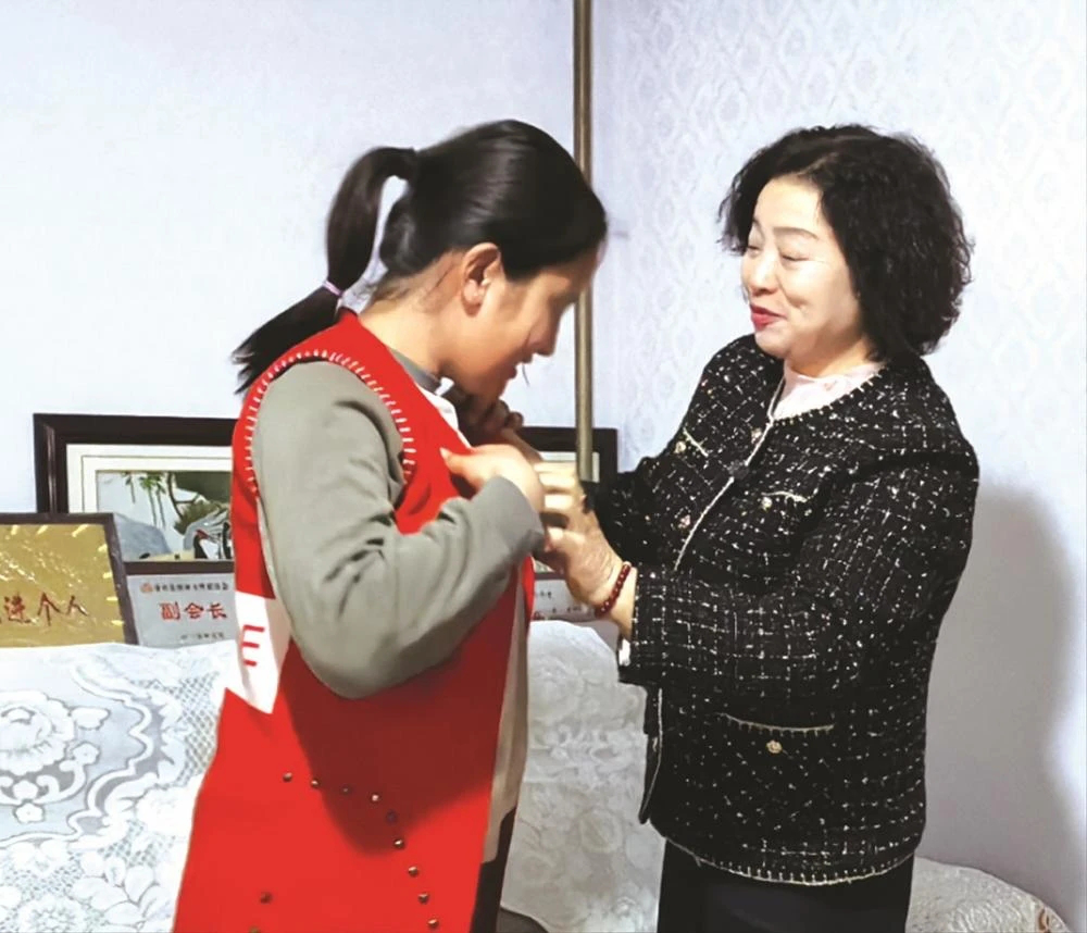 柯玉梅(右)为古丽米热试穿新衣。(奇台县委宣传部供图)