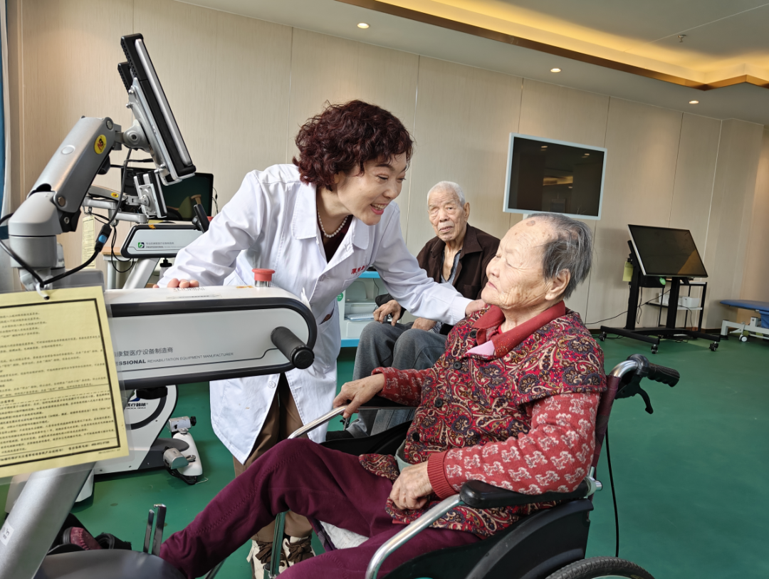 董梅德陪伴老人做康复治疗。(昌吉市委宣传部供图)
