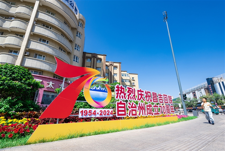 礼赞昌吉辉煌70年 建设典范地州谱新篇|昌吉市飞马转盘路口处的州庆主题造型花卉