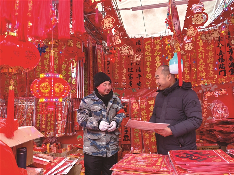 1月13日,在户外大集年货销售区,记者看到,以蛇图案、蛇元素为主题的,各式各样、火红喜庆的春联、福字、灯笼、蛇年吉祥物等被摆放在显眼位置,将年货销售区点缀得分外喜庆热闹,吸引了不少市民群众前来选购。