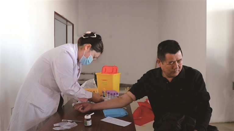 近日,呼图壁县总医院大丰镇分院组织医务人员,走进县工业园区为400名企业职工开展免费健康体检。图为医务人员为企业职工做血常规检查。 □吾拉恩·巴合提努尔摄