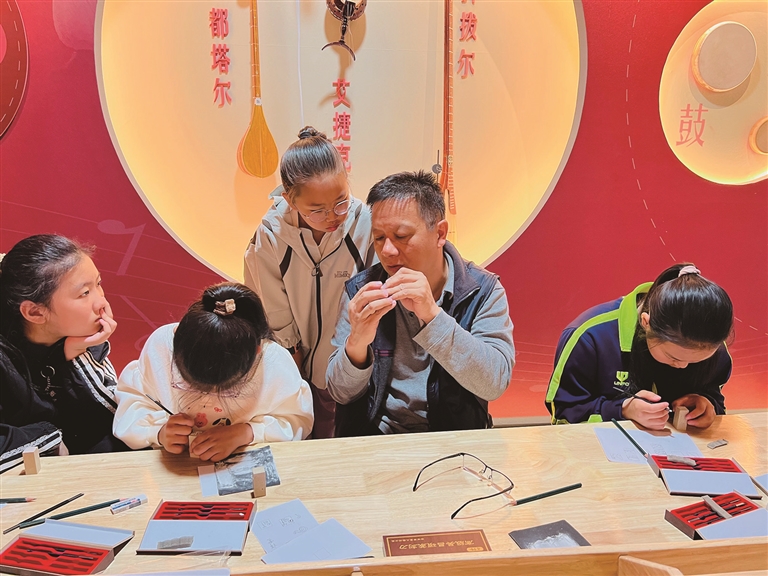 5月2日,昌吉州文化馆举办非遗展示与传习活动。图为群众体验石刻项目。记者 左晓雨摄
