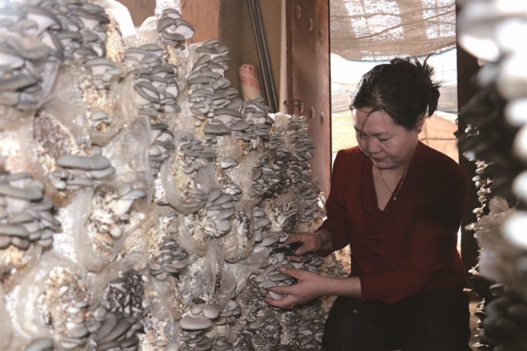 李菊兰在大棚里采摘平菇。□刘玉洁摄