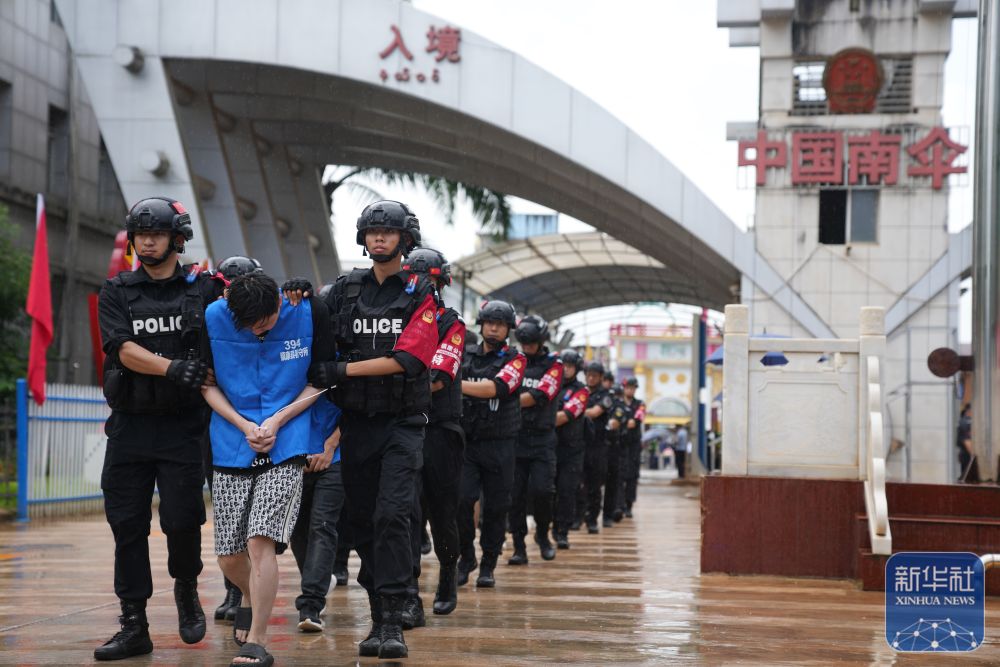 ↑2023年10月7日,在云南省南伞口岸,中国籍电信网络诈骗犯罪嫌疑人被移交我方。新华社发(公安部刑侦局供图)