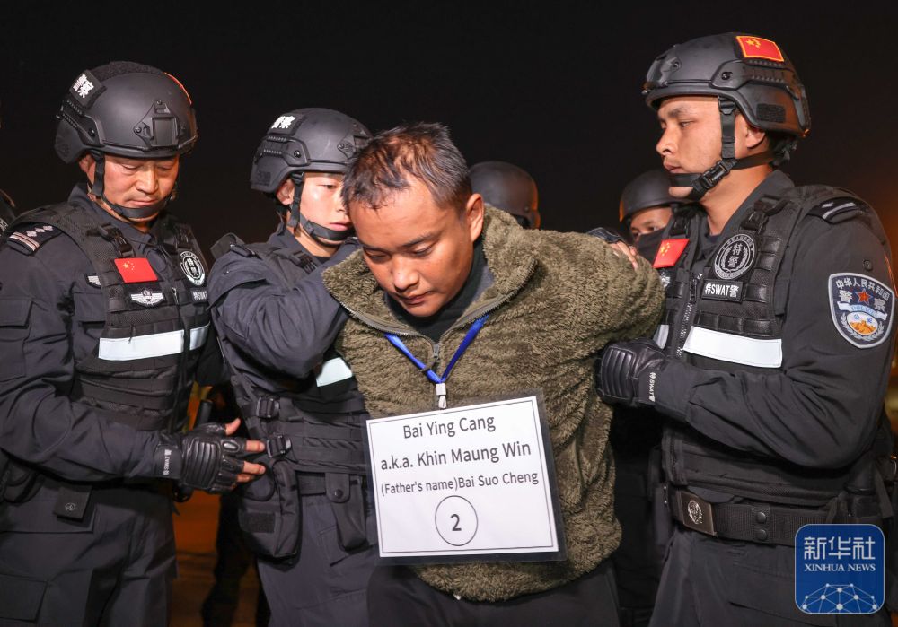 ↑2023年11月16日,缅北果敢自治区电信网络诈骗犯罪集团重要头目明国平(右五)、明珍珍(右二)被移交我公安机关。新华社发(公安部刑侦局供图)