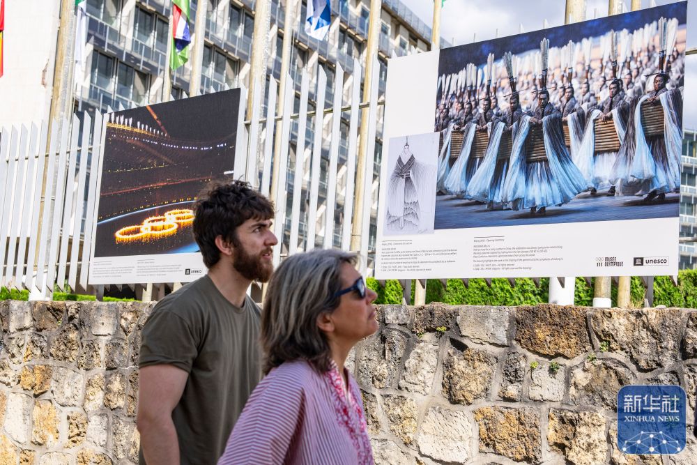 ↑7月6日,参观者观看联合国教科文组织展出的北京奥运会开幕式照片。新华社记者 许畅 摄