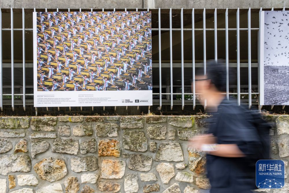 ↑7月6日,一名参观者从联合国教科文组织展出的北京奥运会开幕式照片前走过。新华社记者 孙非 摄