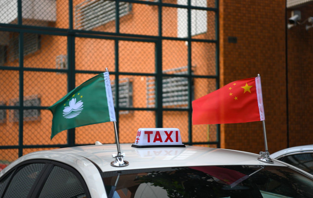 12月20日,一辆澳门出租车上插着国旗和区旗。