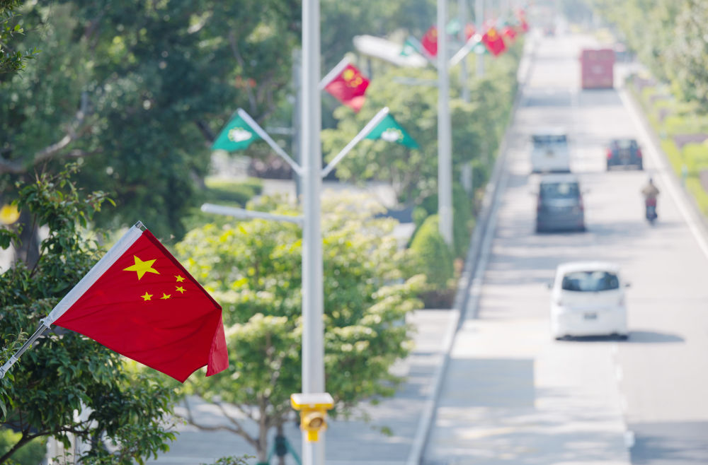 12月20日,澳门街头悬挂的国旗与区旗迎风飘扬。