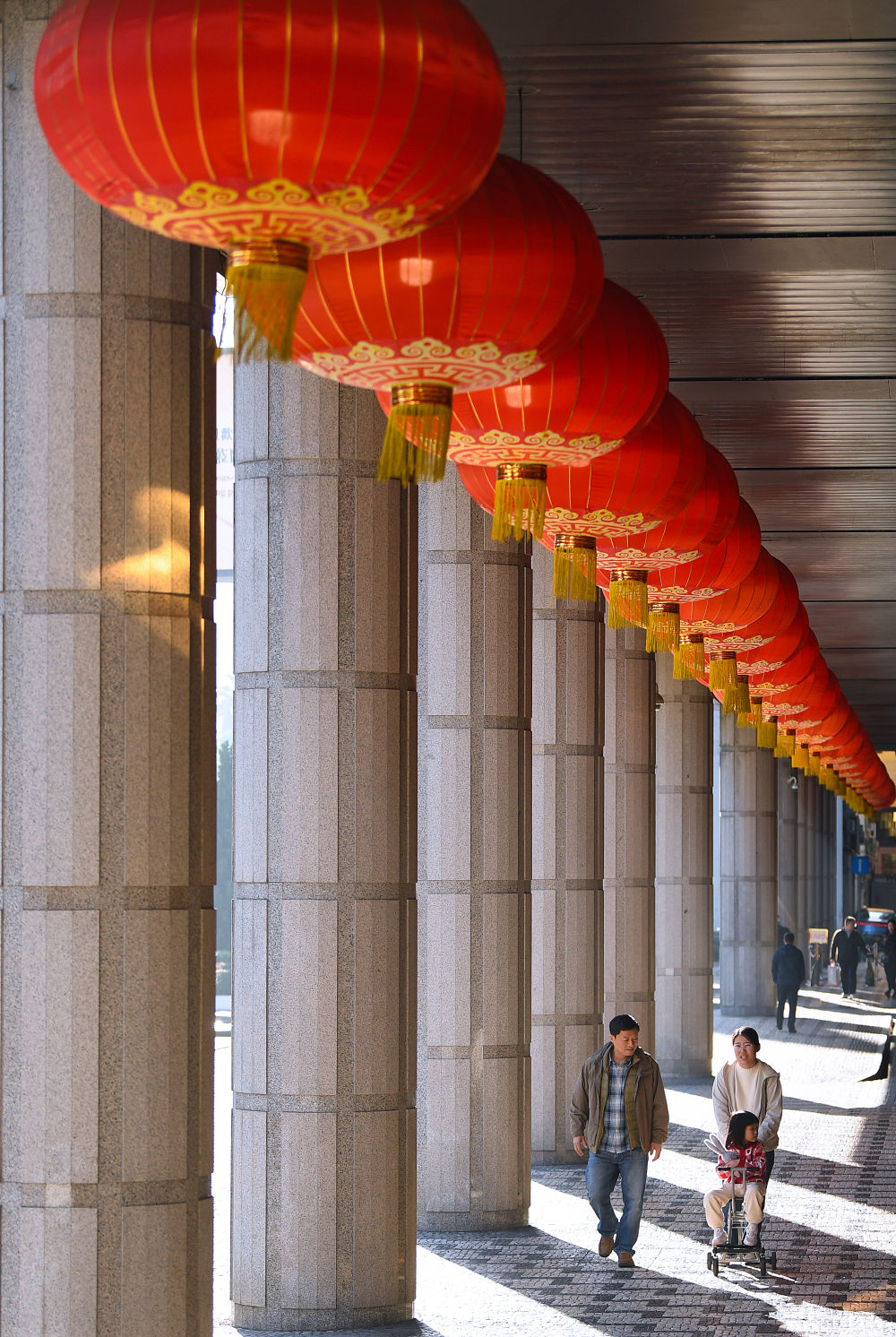 12月20日,行人从悬挂着大红灯笼的澳门街头走过。