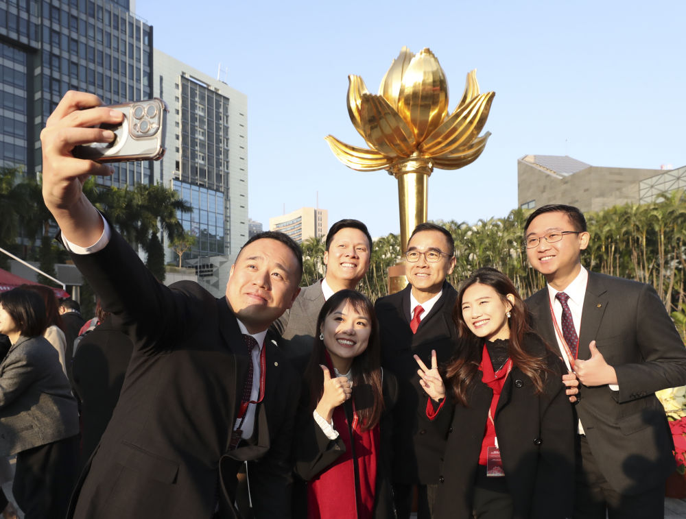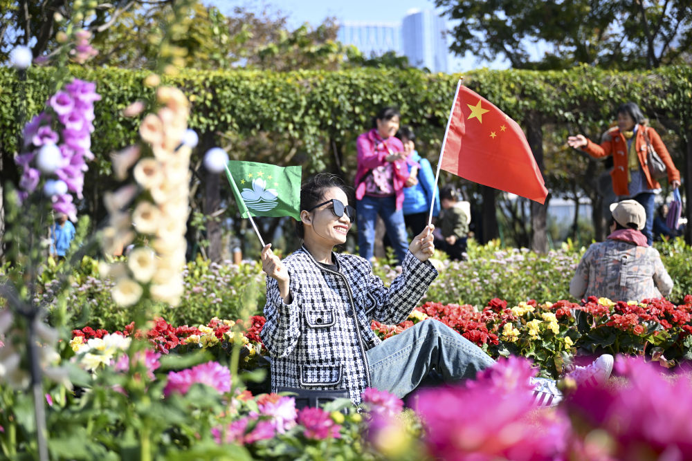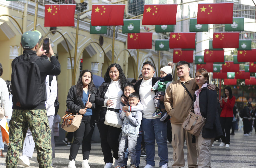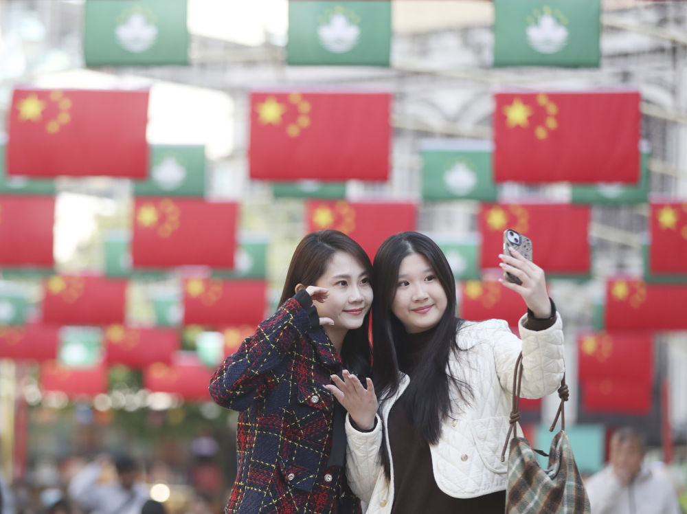 12月20日,游客在澳门街头挥舞国旗和区旗留影。