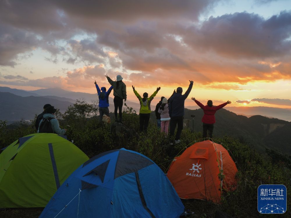 2025年1月1日,户外运动爱好者在云南省德宏傣族景颇族自治州芒市大拱山上看日出。新华社发(张仁韬摄)