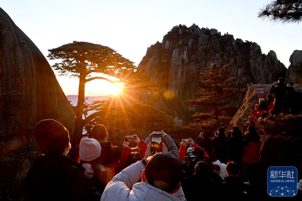 2025年1月1日,游客在安徽黄山风景区迎客松景点观赏日出。新华社记者 黄博涵 摄