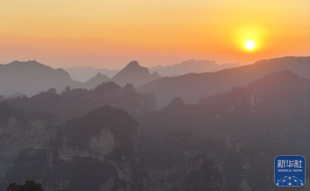 2025年1月1日拍摄的湖南张家界国家森林公园黄石寨日出景象(无人机照片)。新华社发(吴勇兵摄)