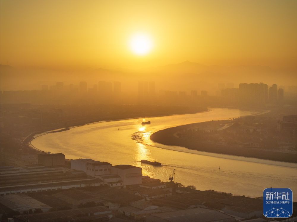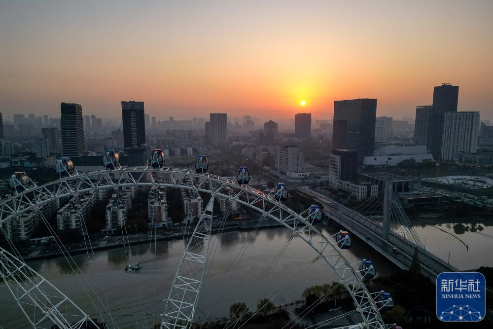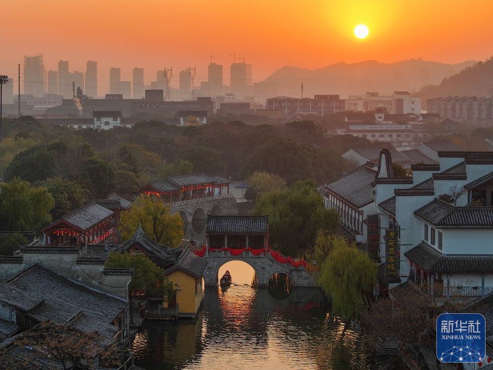2025年1月1日在浙江省绍兴市柯桥区安昌古镇拍摄的日出景象(无人机照片)。新华社发(高飘然摄)