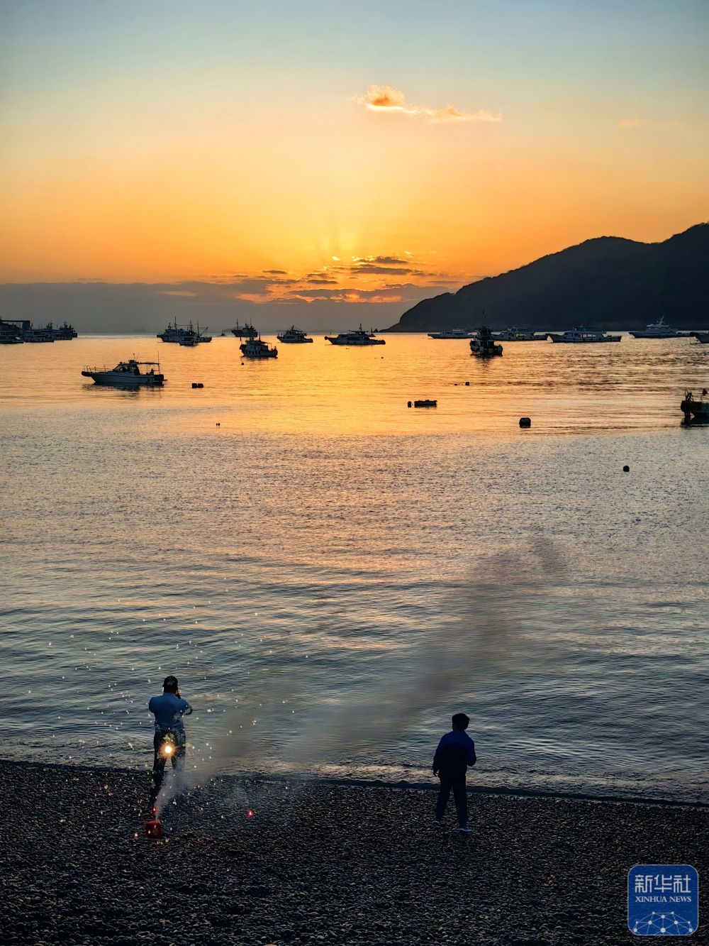 2025年1月1日,游客在浙江舟山朱家尖乌石塘景区迎接新年第一缕阳光。新华社发(邢守秒摄)