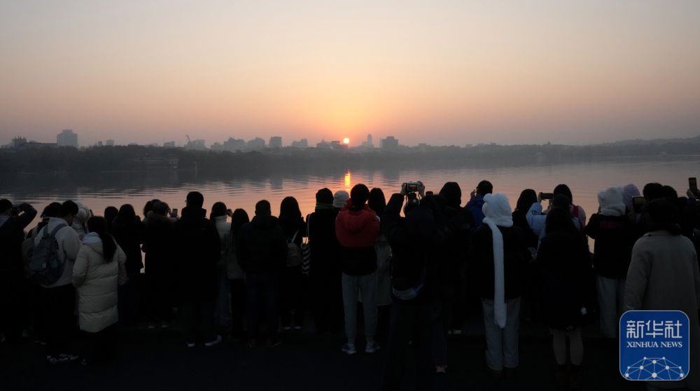2025年1月1日,游客在杭州西湖迎接新年第一缕阳光。新华社记者 韩传号 摄