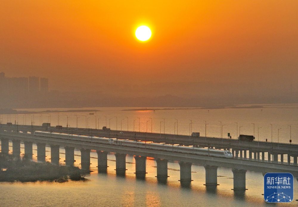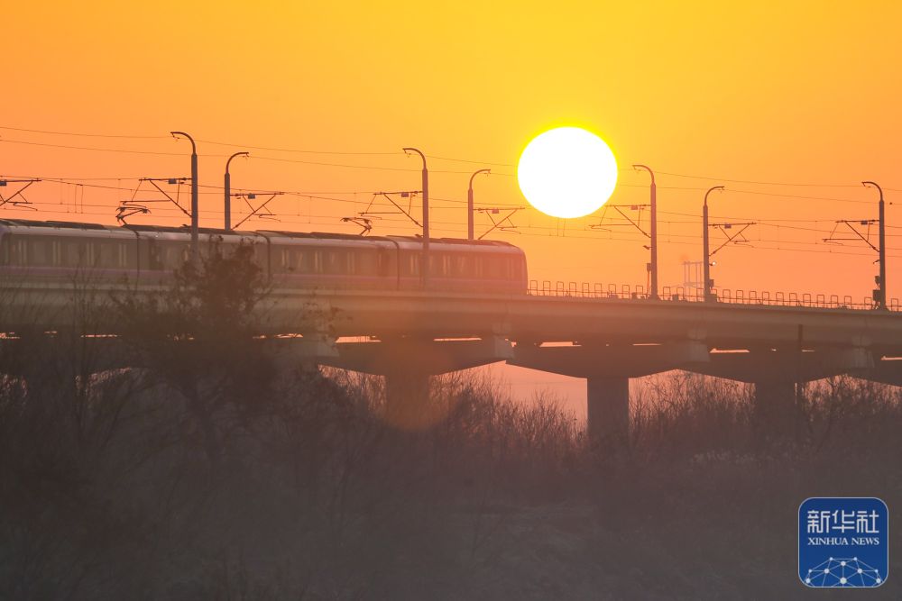 2025年1月1日,列车沐浴朝阳的光辉行驶在江苏省镇江市境内。新华社发(钟学满摄)