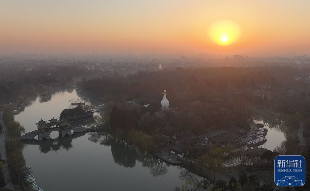 2025年1月1日在江苏扬州瘦西湖景区拍摄的日出景象(无人机照片)。新华社发(孟德龙摄)