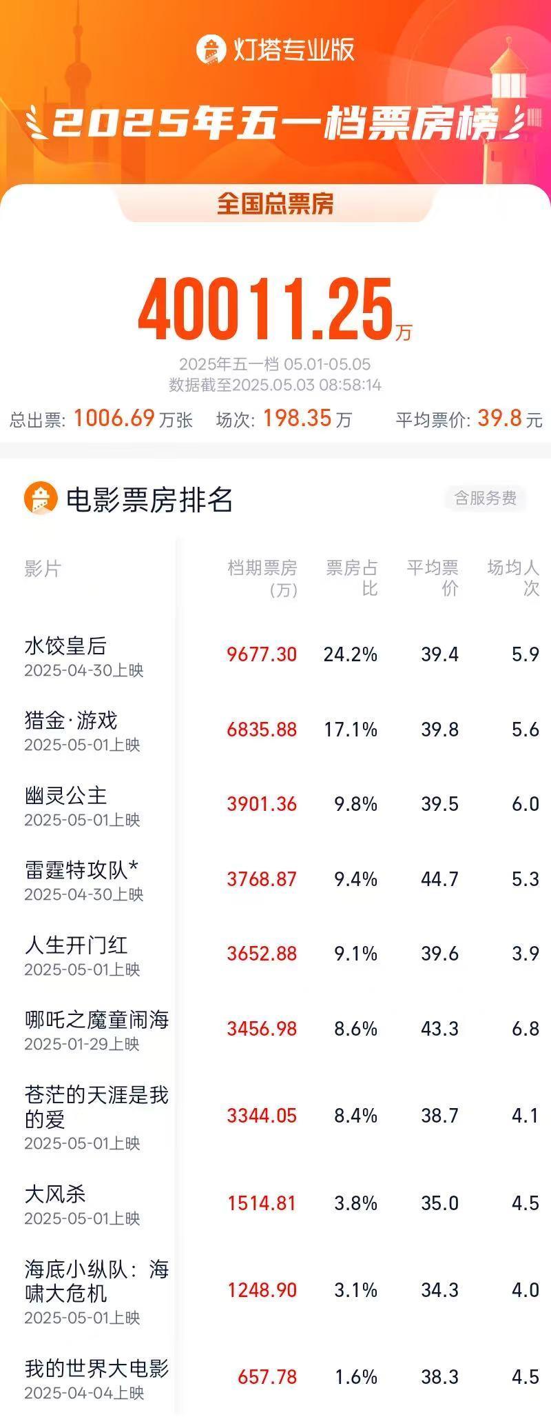 A+ A. A-据网络平台,截至5月3日8时58分,2025年五一档(5月1日—5月5日)档期内总票房(含预售)突破4亿,影片《水饺皇后》《猎金·游戏》《幽灵公主》暂列前三名。