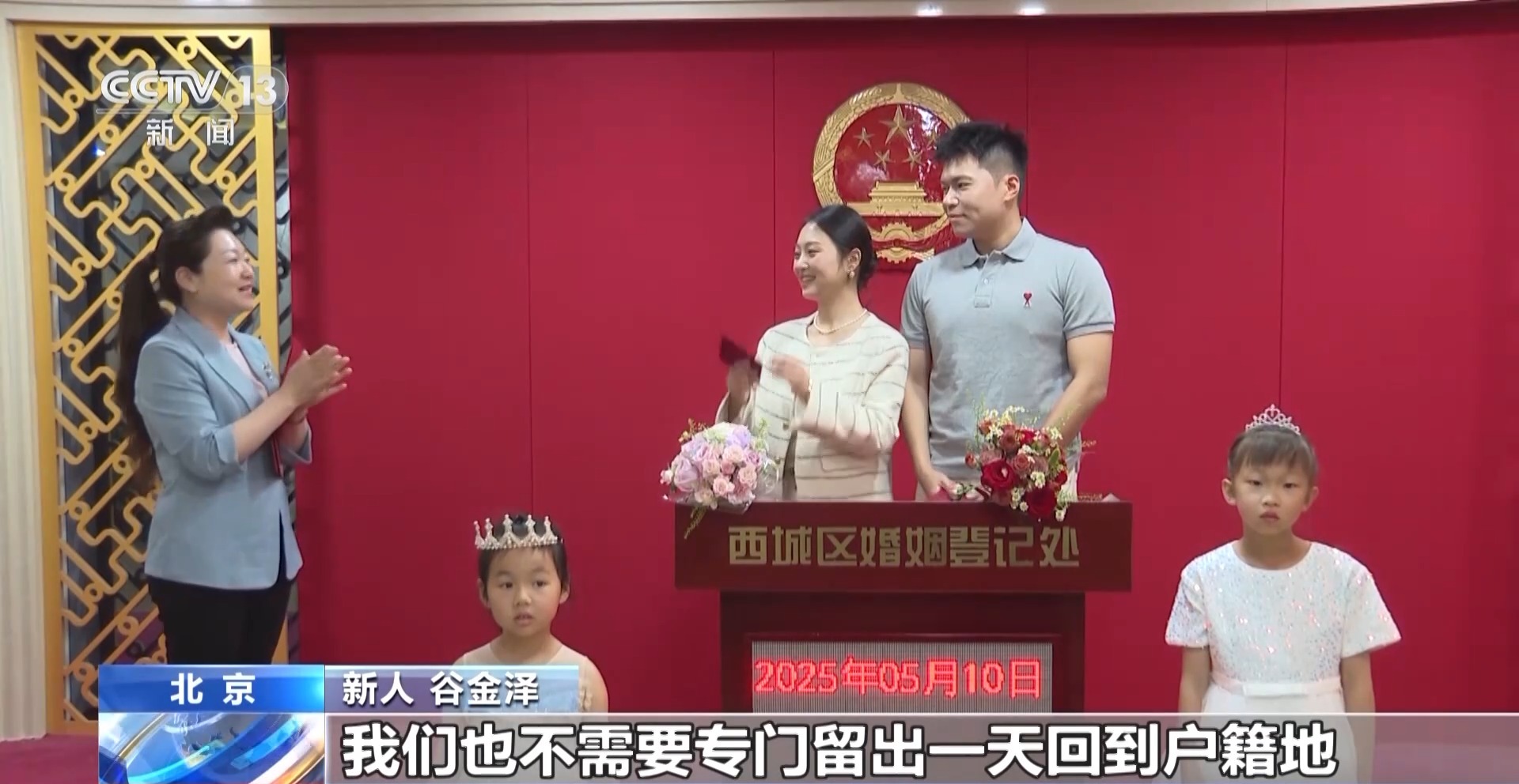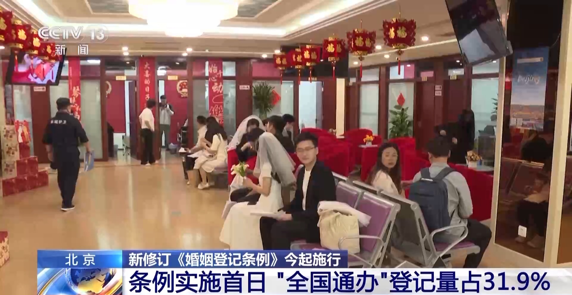 记者从北京市民政局了解到,新政策实施首日,5月10日,北京市共办理婚姻登记1400余对,其中,全国通办登记量占比31.9%。