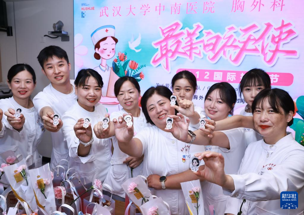5月12日,武汉大学中南医院胸外科护士展示护士节纪念章。新华社发(赵军摄)