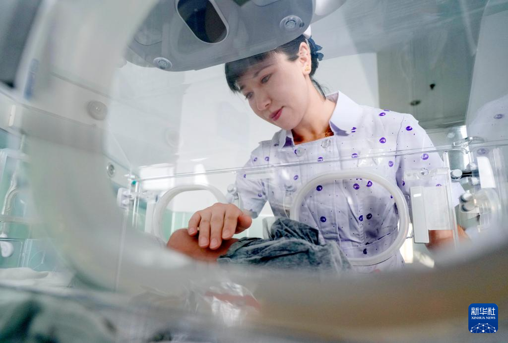 5月12日,在黑龙江省大兴安岭地区人民医院妇产科,护士在照护新生儿宝宝。新华社发(程泓淳摄)