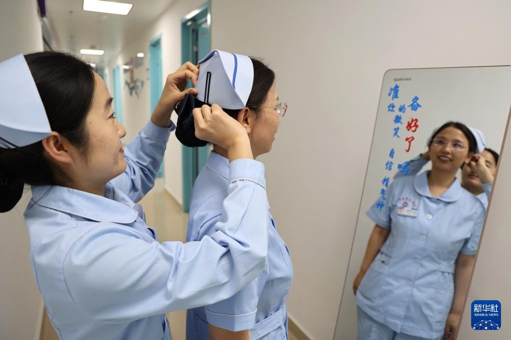 5月12日,山东省滨州市阳信县中医医院心内科的护士在互相整理护士帽。新华社发(初宝瑞摄)