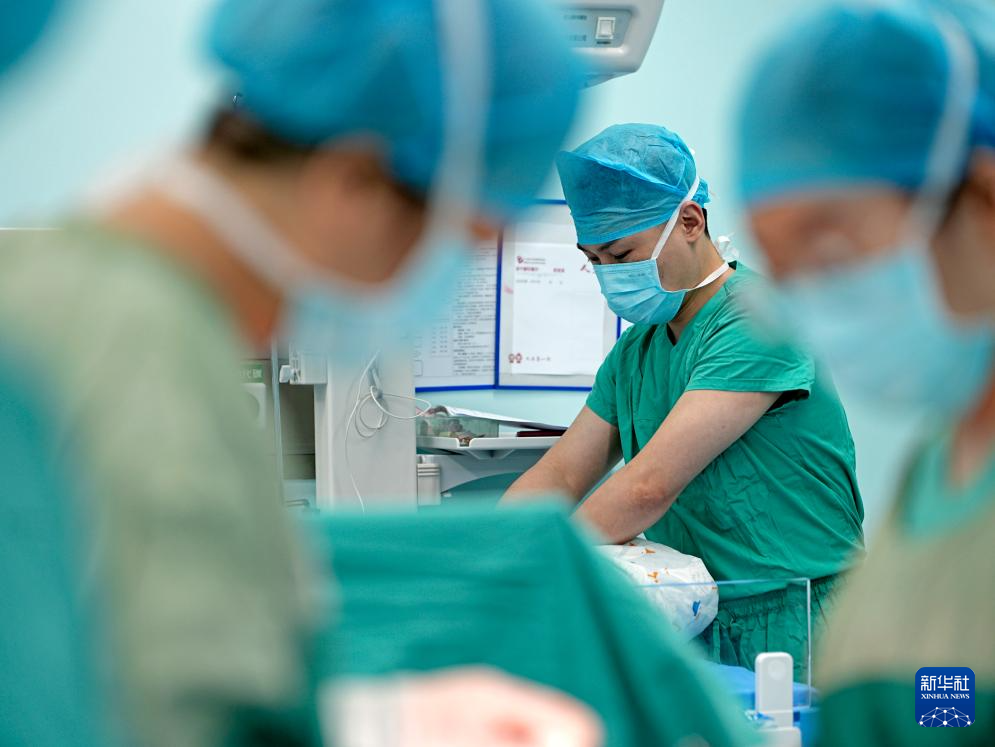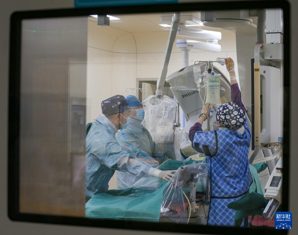 5月12日,在江苏省句容市人民医院介入手术室,医护人员在进行冠状动脉支架植入术。新华社发(钟学满摄)