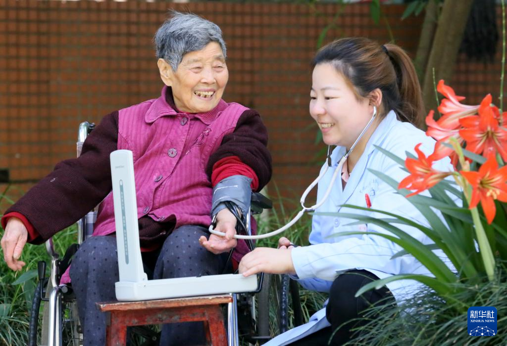5月12日,在四川省乐山市市中区大佛缘养老院,乐山市大佛街道社区卫生院一名医护人员在为老人测量血压。新华社发(李华时摄)