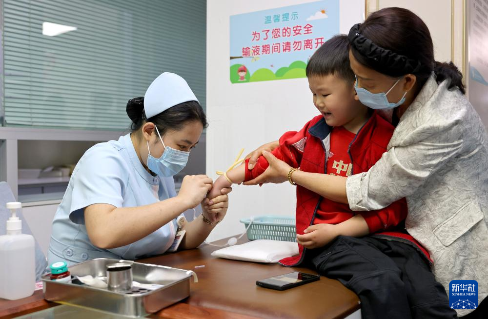 5月12日,山东省枣庄市妇幼保健院的护士在门诊输液室准备为小朋友输液。新华社发(孙中喆摄)