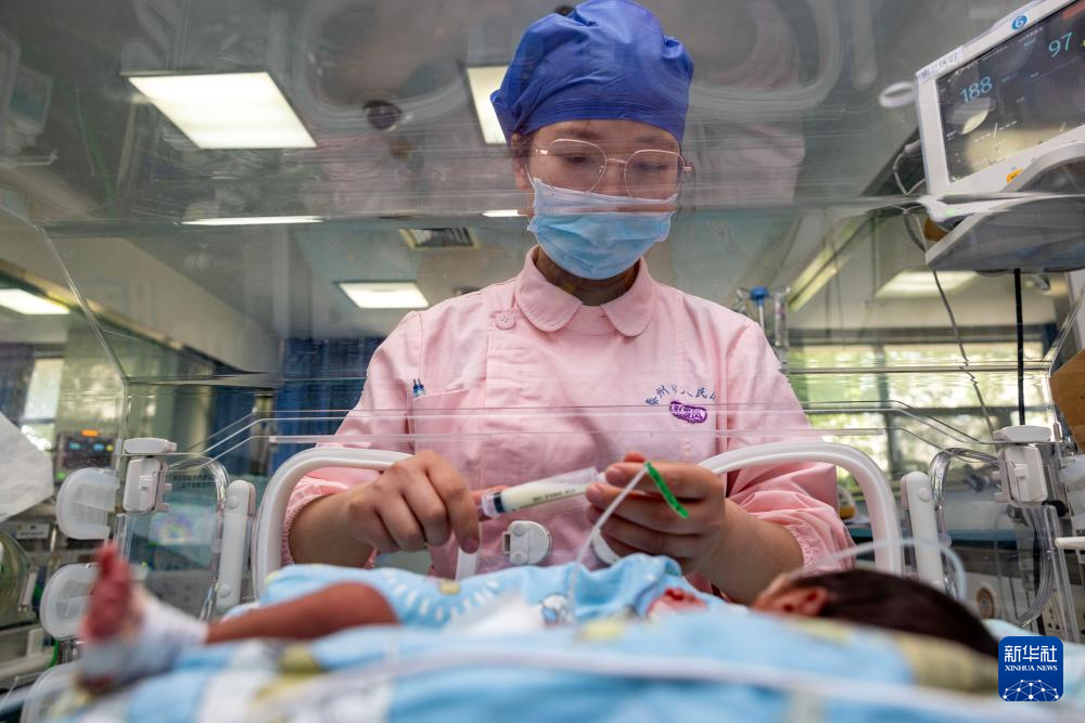 5月12日,南京医科大学附属泰州人民医院新生儿重症监护室的护士在给新生儿喂奶。新华社发(汤德宏摄)