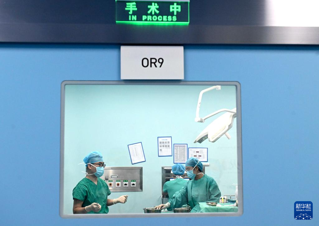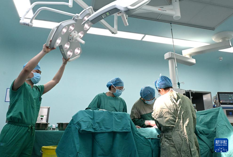 5月12日,男护士孟晓林(左一)在石家庄市妇产医院手术室协助医生做手术。新华社发(陈其保摄)