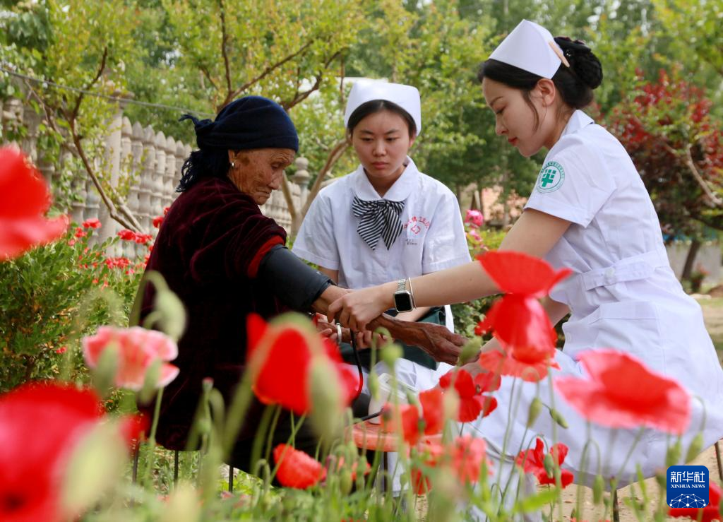 5月12日,在山东省临沂市平邑县保太镇西埠阴村,保太镇卫生院的护士在为村民免费测量血压。新华社发(武纪全摄)