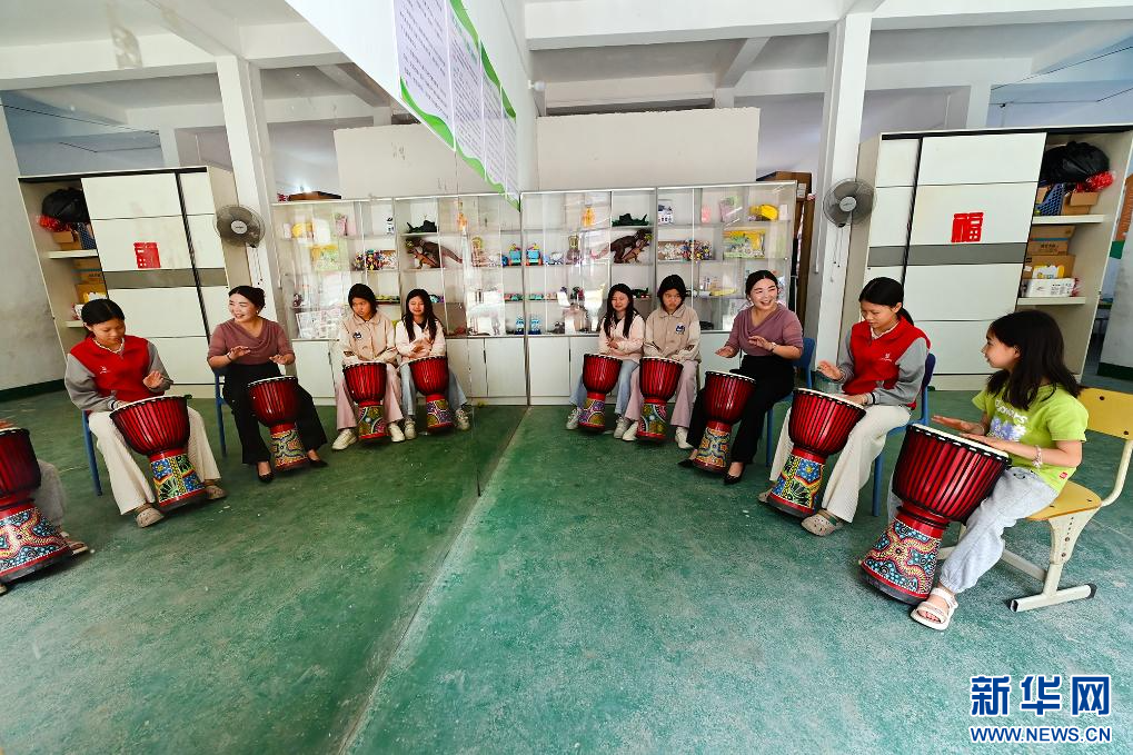 近日,在江西省宜春市万载县白水乡鲁冰花驿站,辛福娥(右3)与孩子们一起在镜子前练习敲手鼓。新华网发 邓龙华 摄