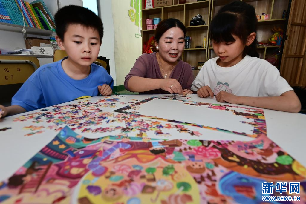 近日,在江西省宜春市万载县白水乡鲁冰花驿站,辛福娥(中)与孩子们一起拼图。新华网发 邓龙华 摄