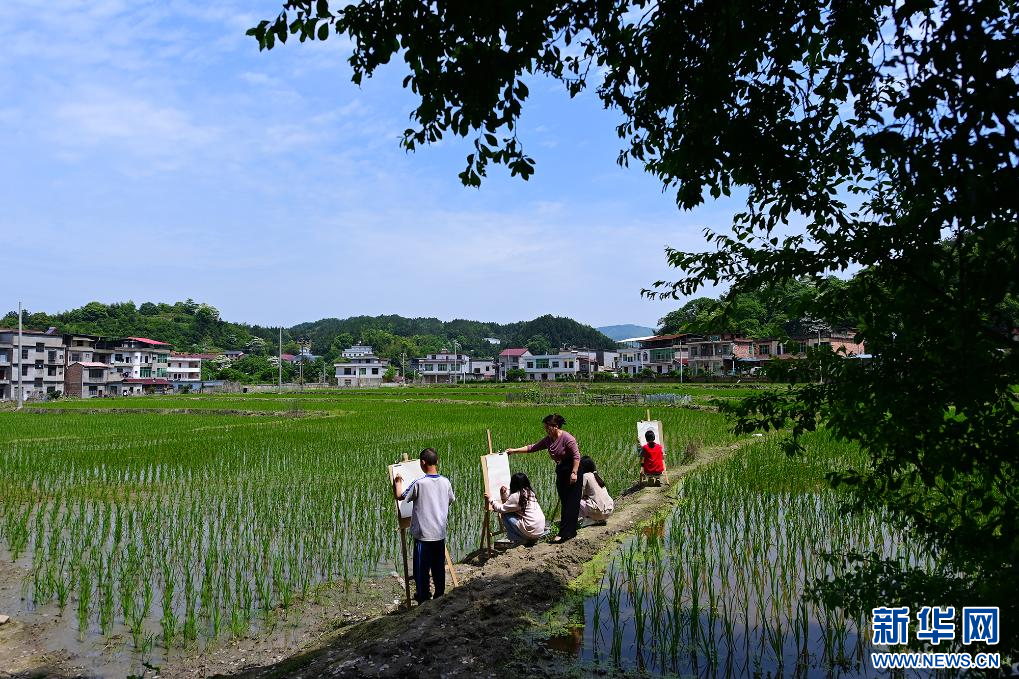 近日,在江西省宜春市万载县白水乡田间,辛福娥(中)与部分孩子一起绘制田园山水画。新华网发 邓龙华 摄