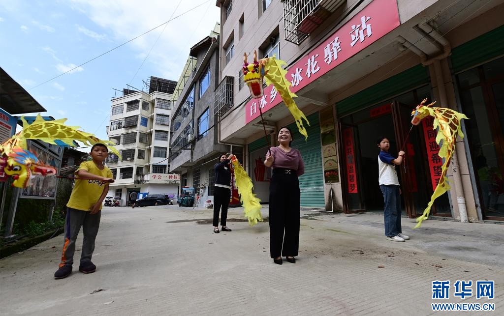 近日,在江西省宜春市万载县白水乡鲁冰花驿站,辛福娥(中)和孩子们一起舞彩带龙。新华网发 邓龙华 摄