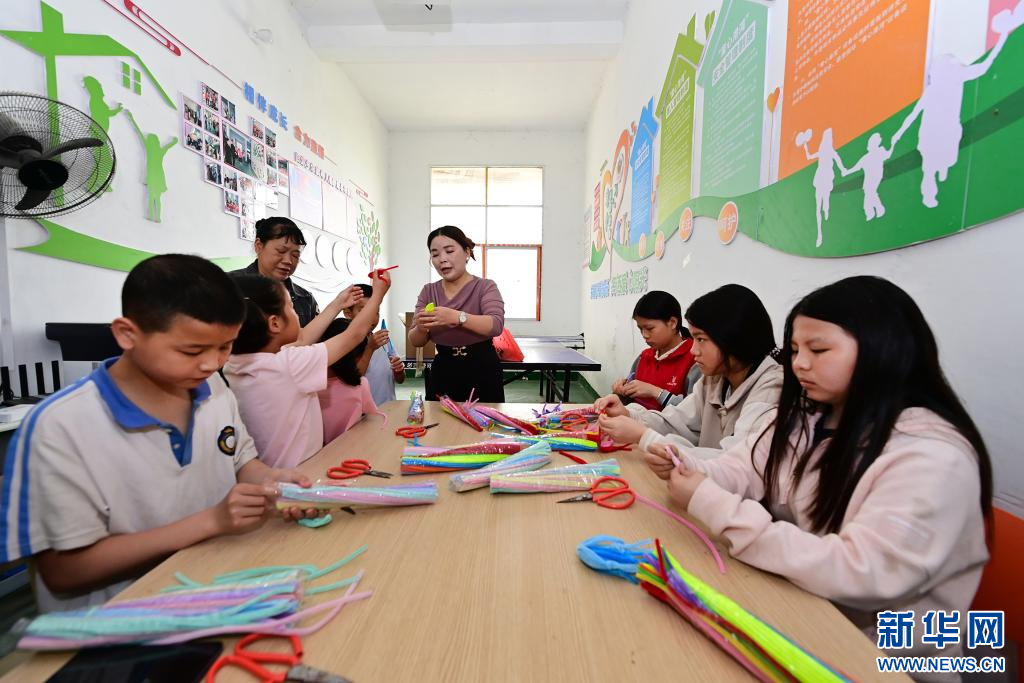 近日,在江西省宜春市万载县白水乡鲁冰花驿站,辛福娥指导孩子们做手工百合花。新华网发 邓龙华 摄