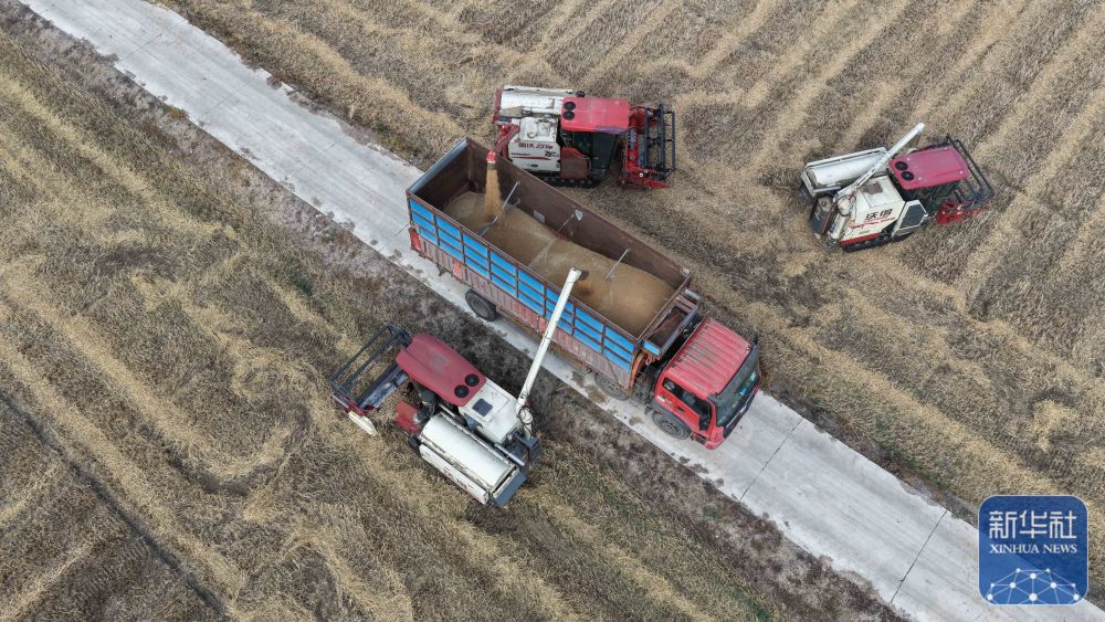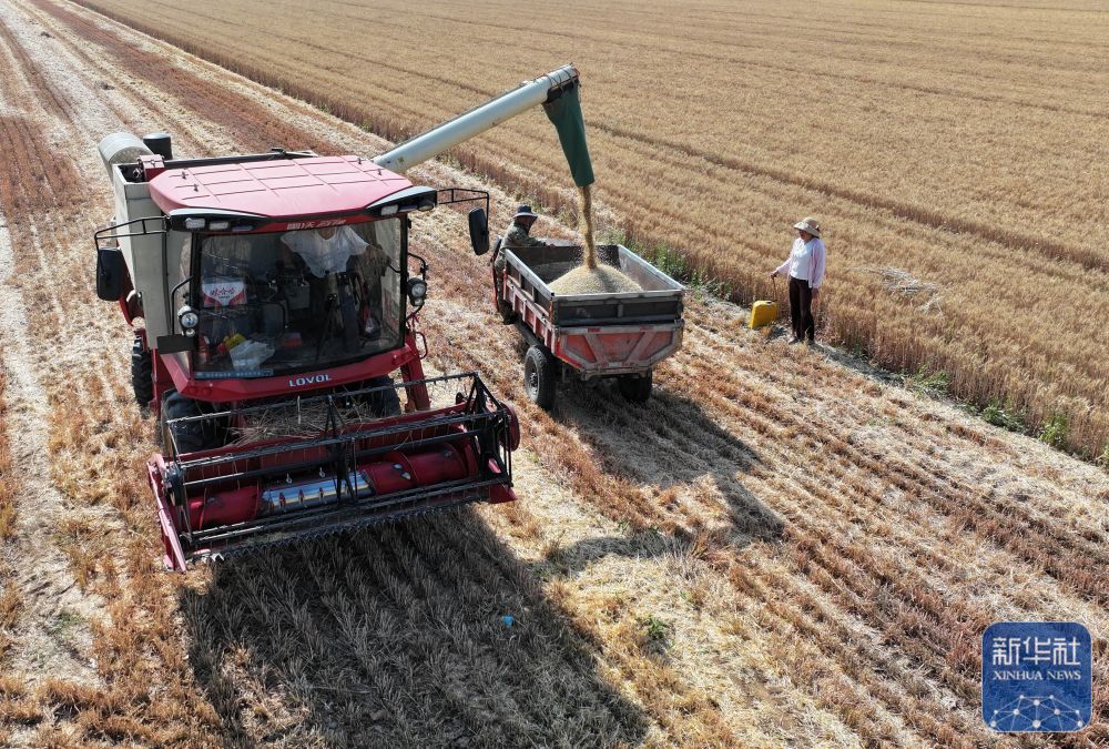 ↑6月5日,在江苏省淮安市洪泽区黄集街道,农机手驾驶收割机将收割的小麦装车(无人机照片)。新华社发(殷潮 摄)